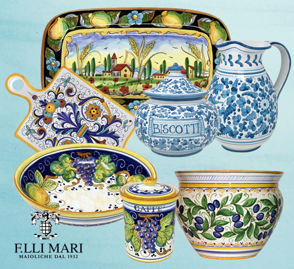 Our Italian ceramics are directly imported from Deruta, Umbria, Castelli & Tuscany, Italy. Many of the patterns we feature date back hundreds of years and many patterns are derived from Renaissance art. Our premier suppliers are: Fratelli Mari Maioliche, Ceramiche Borgioli & Bottega degli Artisti, though we do import from other Italian factories as well.